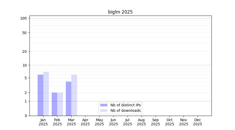 Number of downloads for experiment package biglm, year by year, from 2025 back to 2014 (years with no downloads are omitted):