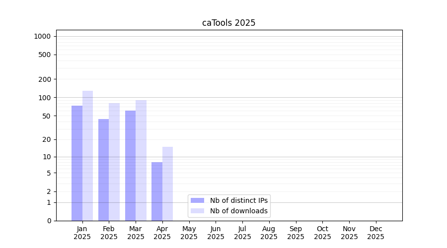 Number of downloads for experiment package caTools, year by year, from 2025 back to 2014 (years with no downloads are omitted):