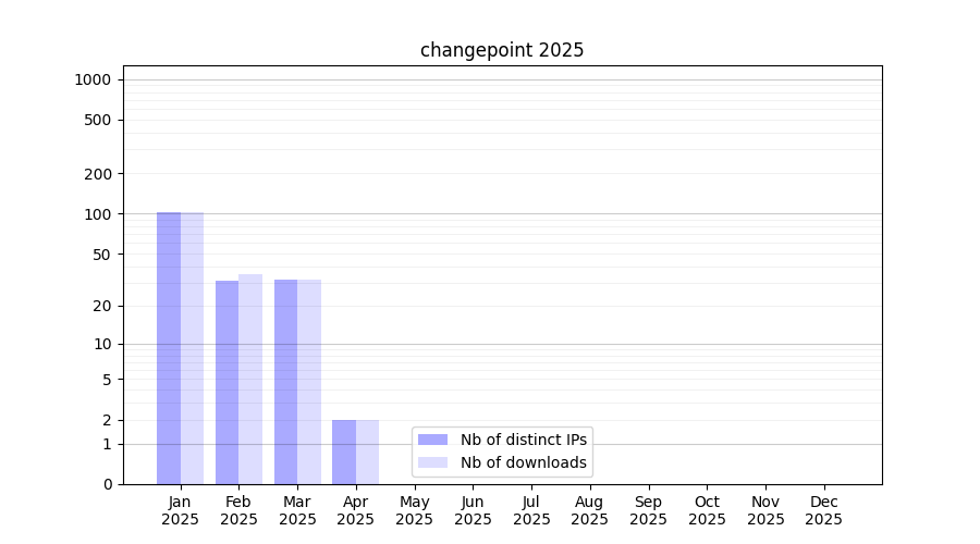 Number of downloads for experiment package changepoint, year by year, from 2025 back to 2014 (years with no downloads are omitted):