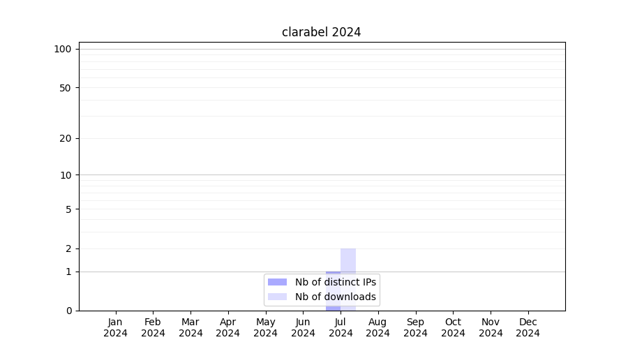 Number of downloads for experiment package clarabel, year by year, from 2025 back to 2014 (years with no downloads are omitted):