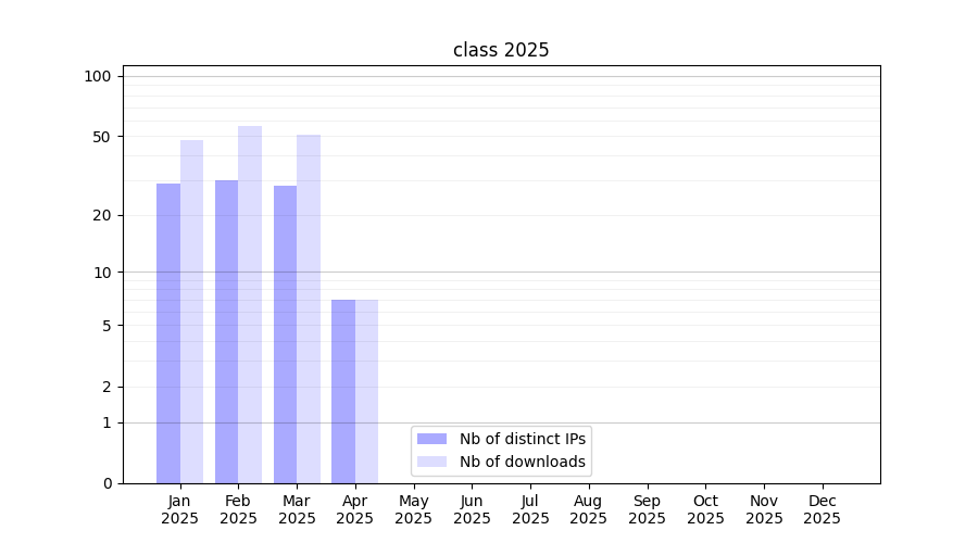 Number of downloads for experiment package class, year by year, from 2025 back to 2014 (years with no downloads are omitted):