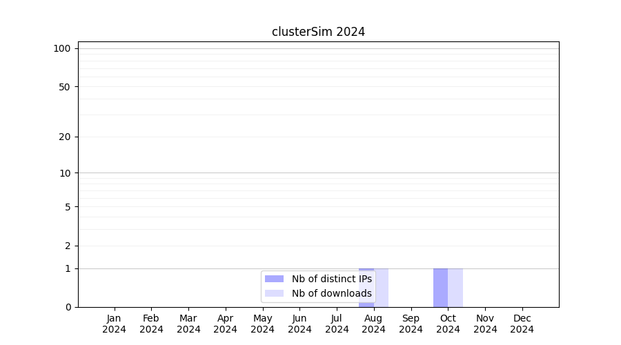 Number of downloads for experiment package clusterSim, year by year, from 2025 back to 2014 (years with no downloads are omitted):