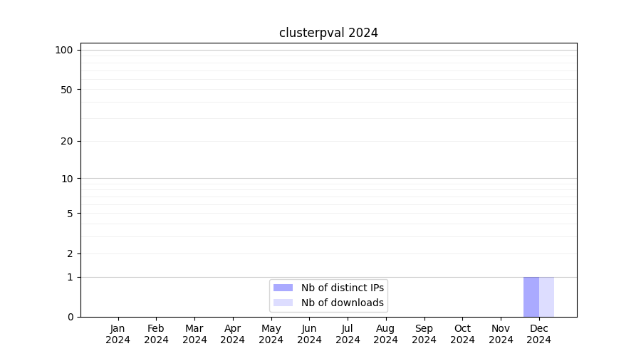 Number of downloads for experiment package clusterpval, year by year, from 2025 back to 2014 (years with no downloads are omitted):