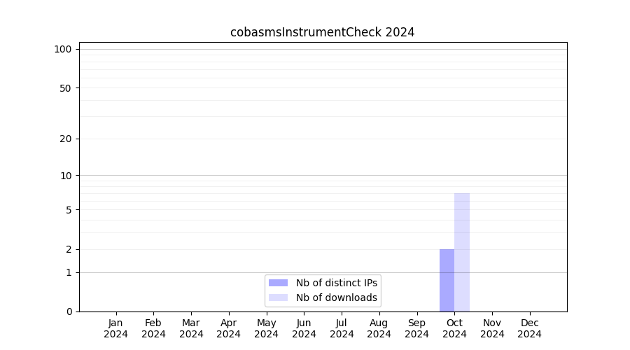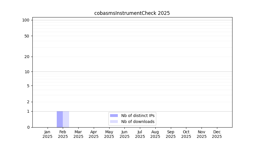 Number of downloads for experiment package cobasmsInstrumentCheck, year by year, from 2025 back to 2014 (years with no downloads are omitted):