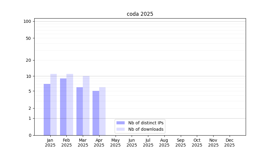 Number of downloads for experiment package coda, year by year, from 2025 back to 2014 (years with no downloads are omitted):