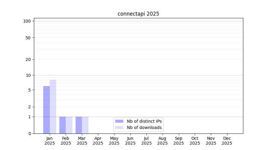 Number of downloads for experiment package connectapi, year by year, from 2025 back to 2014 (years with no downloads are omitted):