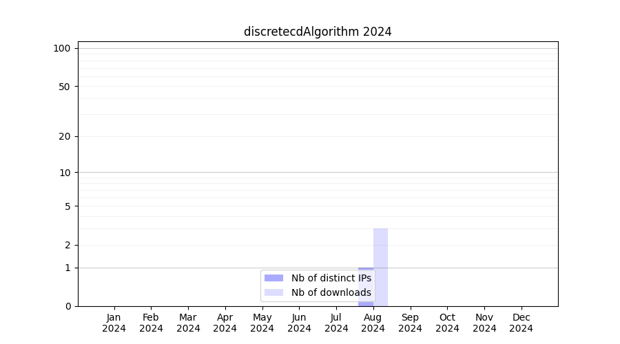 Number of downloads for experiment package discretecdAlgorithm, year by year, from 2025 back to 2014 (years with no downloads are omitted):
