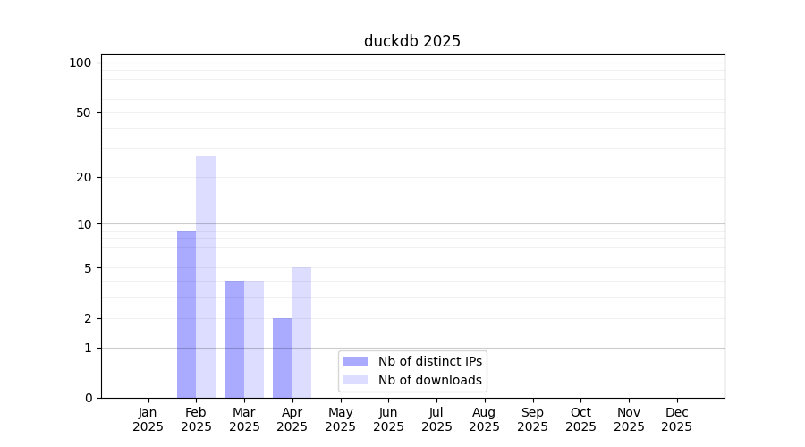 Number of downloads for experiment package duckdb, year by year, from 2025 back to 2014 (years with no downloads are omitted):