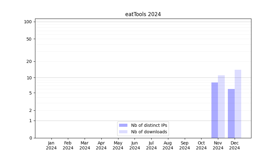 Number of downloads for experiment package eatTools, year by year, from 2025 back to 2014 (years with no downloads are omitted):