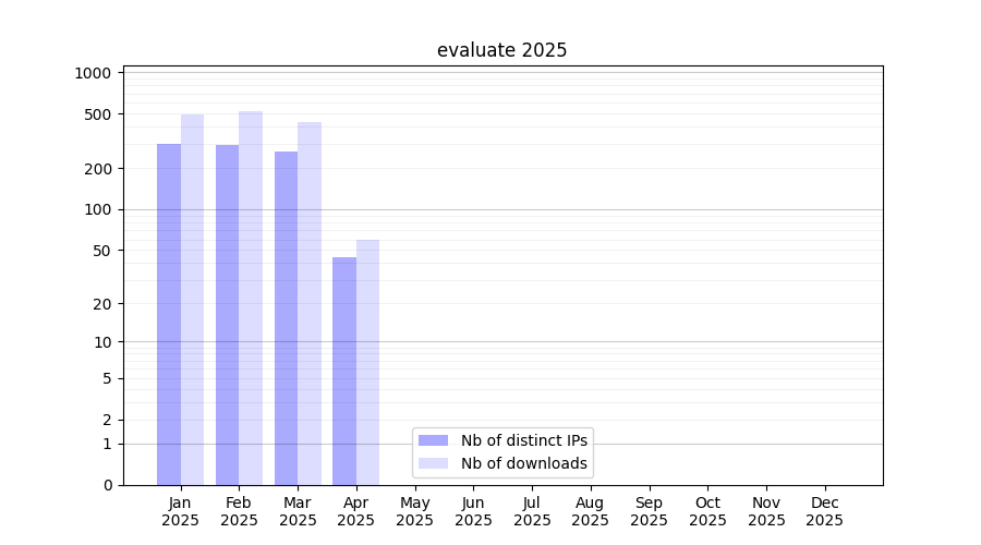 Number of downloads for experiment package evaluate, year by year, from 2025 back to 2014 (years with no downloads are omitted):