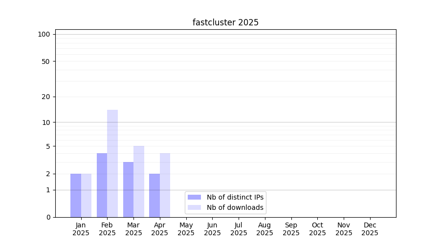 Number of downloads for experiment package fastcluster, year by year, from 2025 back to 2014 (years with no downloads are omitted):