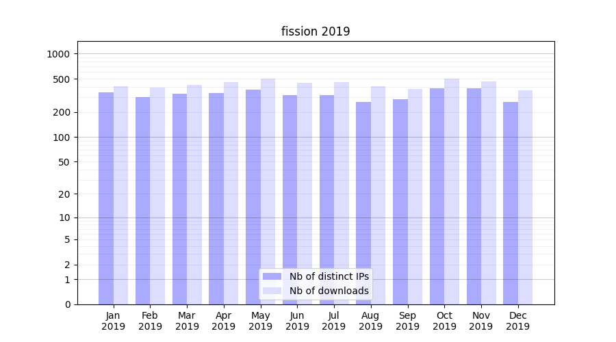 Number of downloads for experiment package fission, year by year, from 2025 back to 2014 (years with no downloads are omitted):