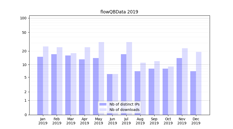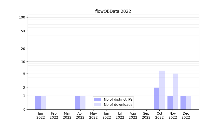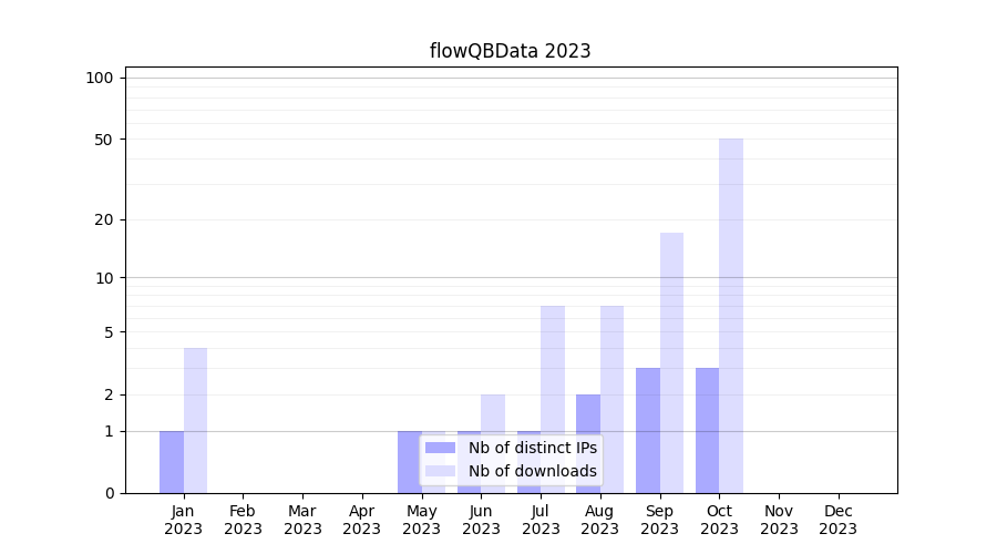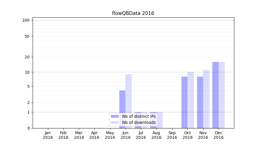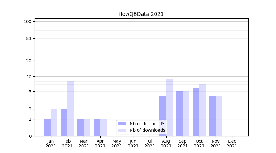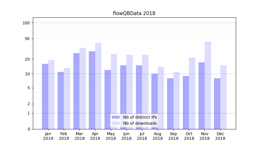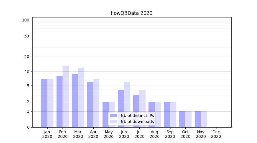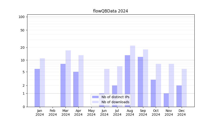 Number of downloads for experiment package flowQBData, year by year, from 2025 back to 2014 (years with no downloads are omitted):