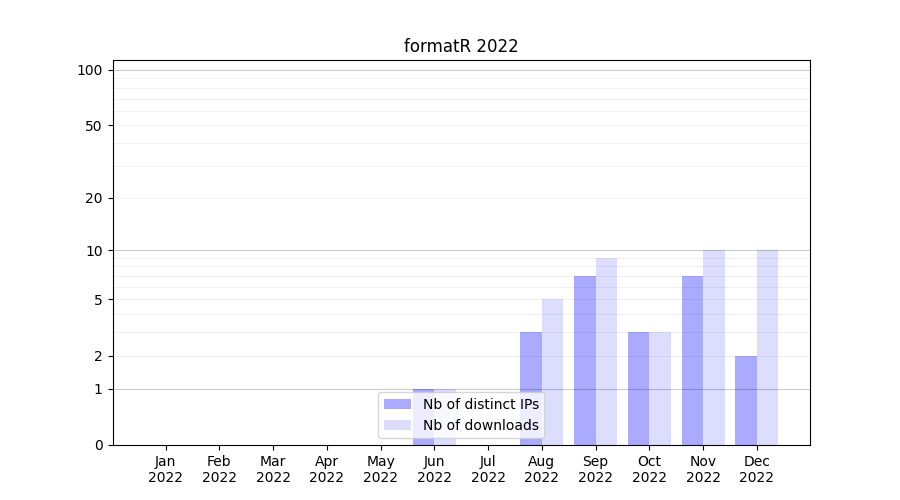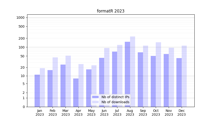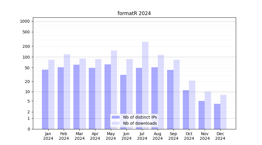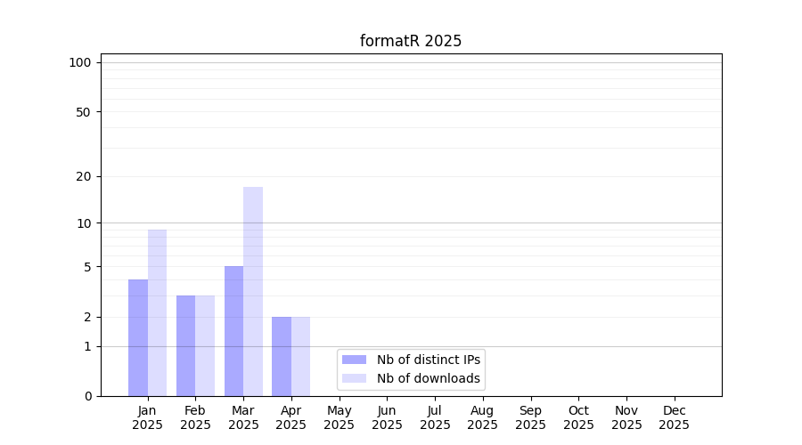 Number of downloads for experiment package formatR, year by year, from 2025 back to 2014 (years with no downloads are omitted):