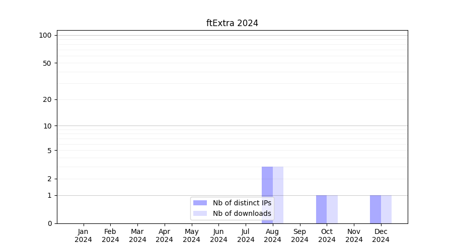 Number of downloads for experiment package ftExtra, year by year, from 2025 back to 2014 (years with no downloads are omitted):