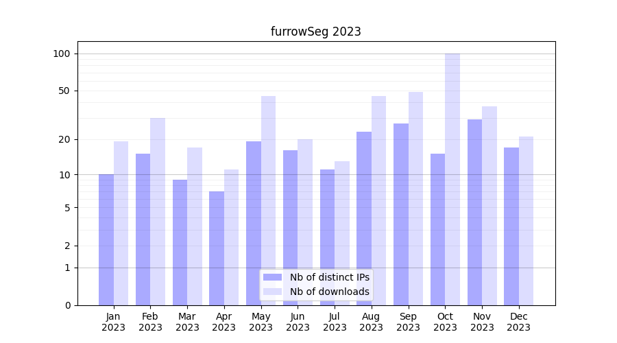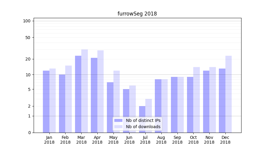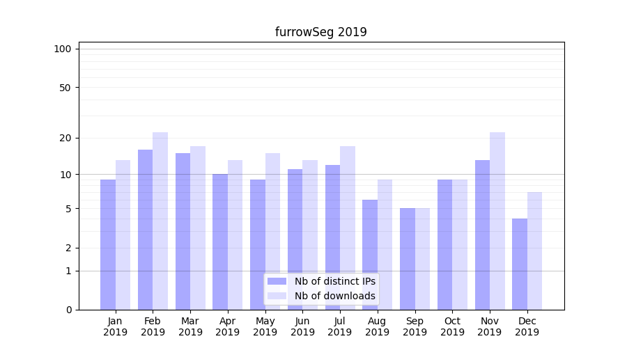 Number of downloads for experiment package furrowSeg, year by year, from 2025 back to 2014 (years with no downloads are omitted):