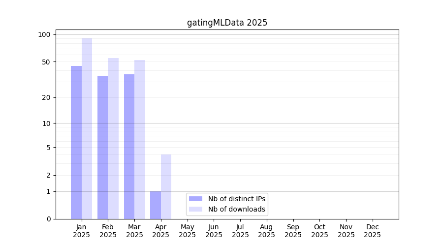 Number of downloads for experiment package gatingMLData, year by year, from 2025 back to 2014 (years with no downloads are omitted):