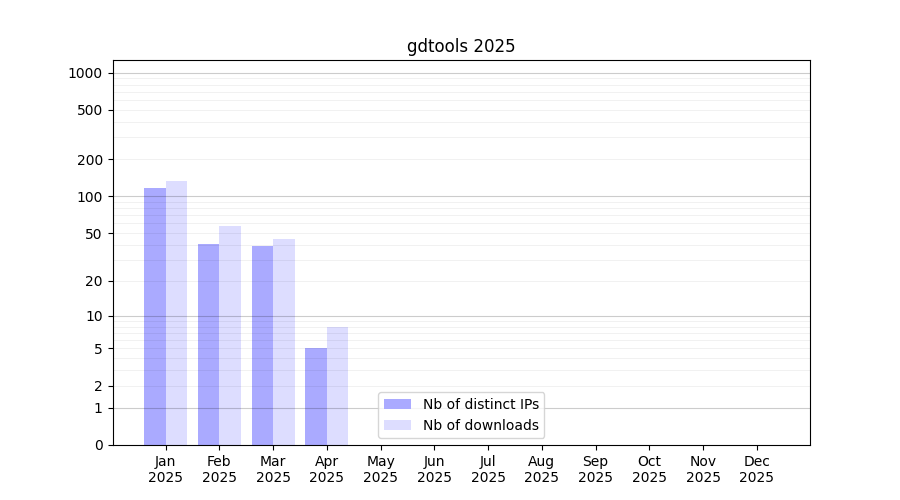 Number of downloads for experiment package gdtools, year by year, from 2025 back to 2014 (years with no downloads are omitted):