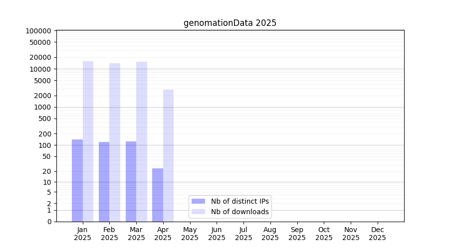 Number of downloads for experiment package genomationData, year by year, from 2025 back to 2014 (years with no downloads are omitted):