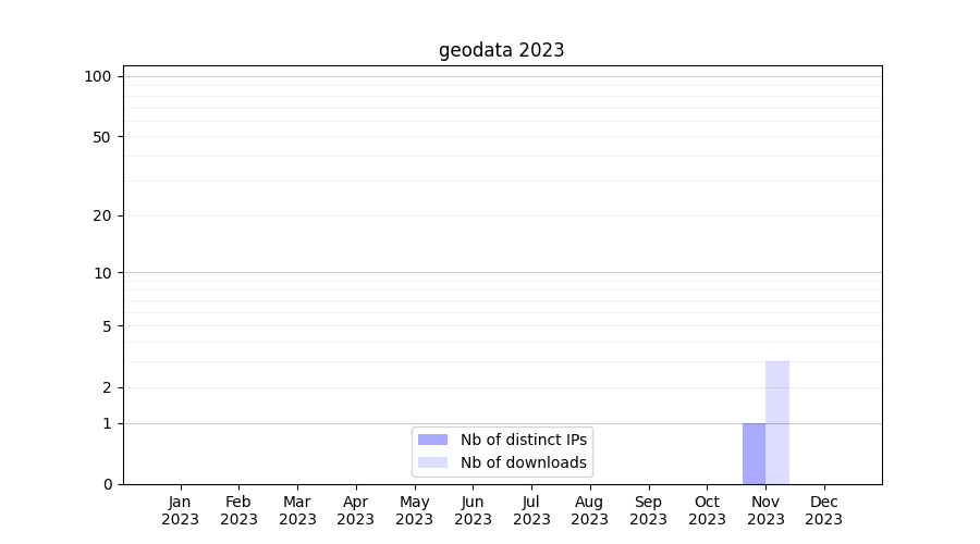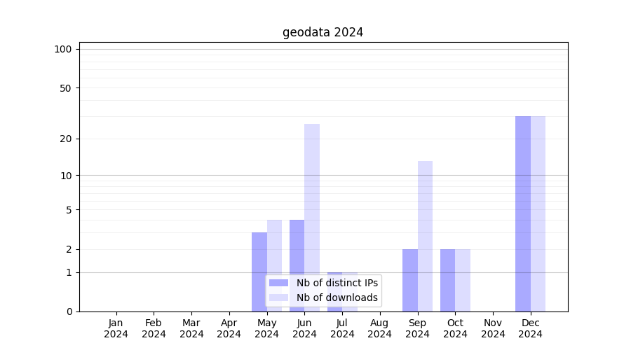 Number of downloads for experiment package geodata, year by year, from 2025 back to 2014 (years with no downloads are omitted):