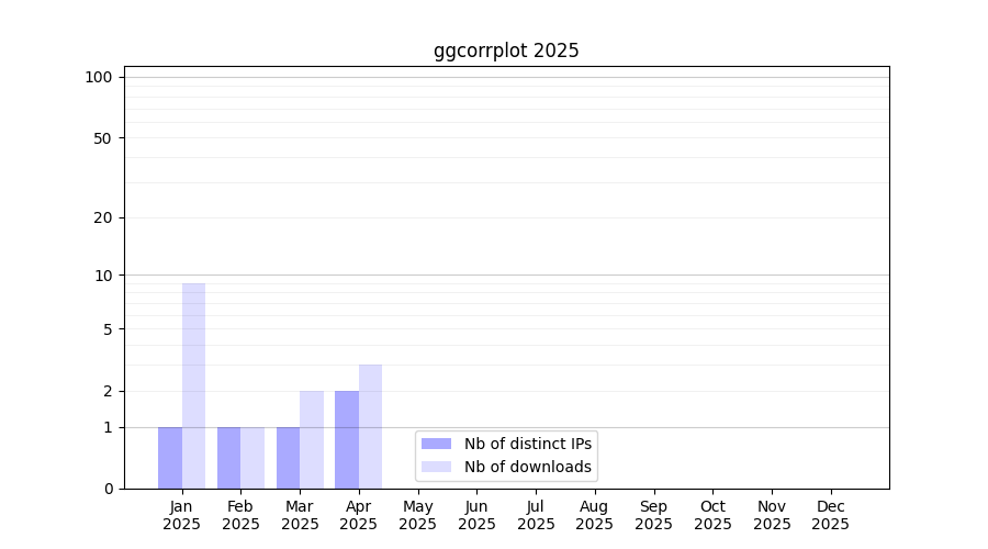 Number of downloads for experiment package ggcorrplot, year by year, from 2025 back to 2014 (years with no downloads are omitted):