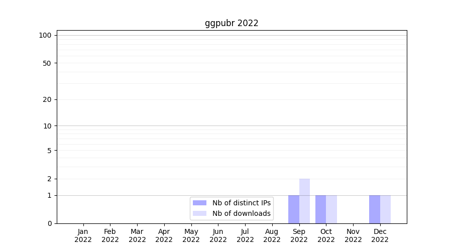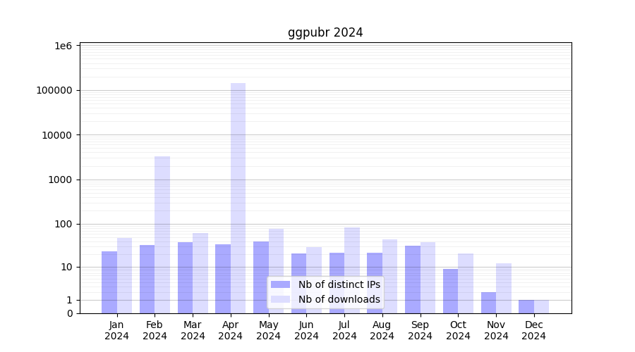 Number of downloads for experiment package ggpubr, year by year, from 2025 back to 2014 (years with no downloads are omitted):