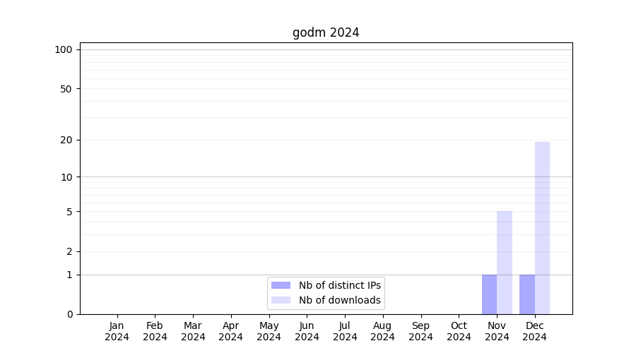 Number of downloads for experiment package godm, year by year, from 2025 back to 2014 (years with no downloads are omitted):