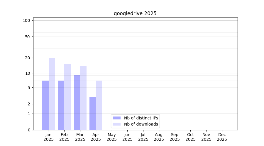 Number of downloads for experiment package googledrive, year by year, from 2025 back to 2014 (years with no downloads are omitted):