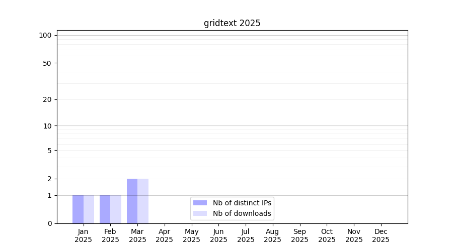Number of downloads for experiment package gridtext, year by year, from 2025 back to 2014 (years with no downloads are omitted):
