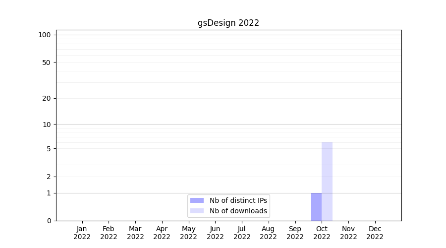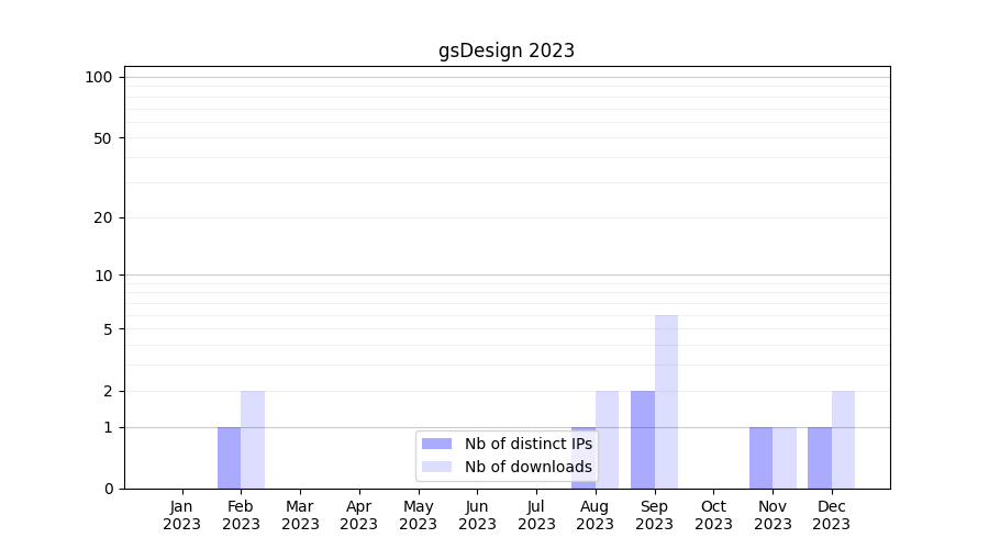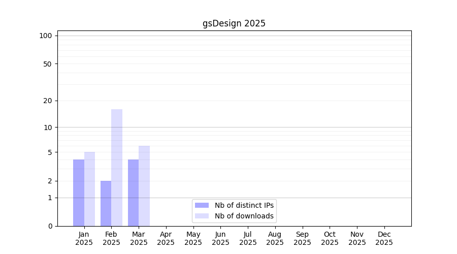 Number of downloads for experiment package gsDesign, year by year, from 2025 back to 2014 (years with no downloads are omitted):