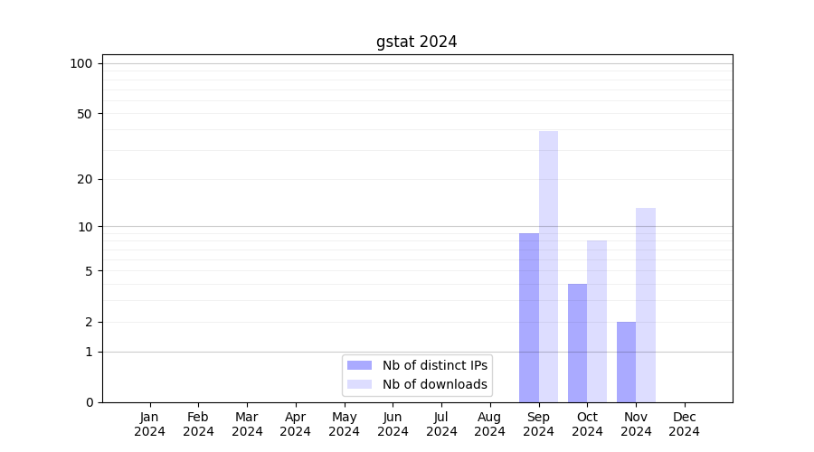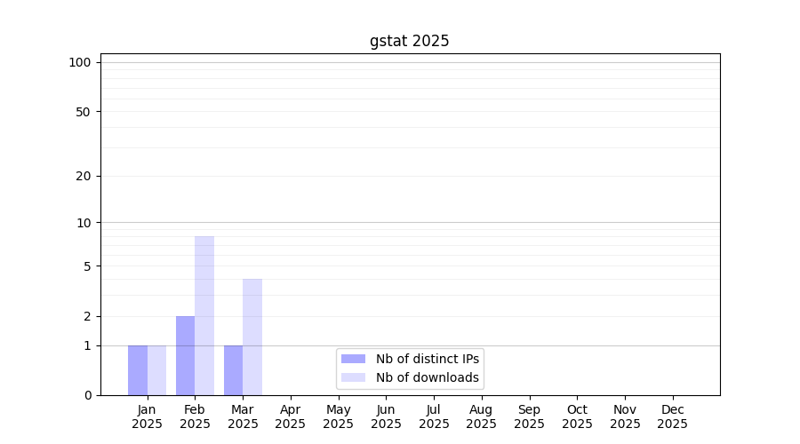 Number of downloads for experiment package gstat, year by year, from 2025 back to 2014 (years with no downloads are omitted):