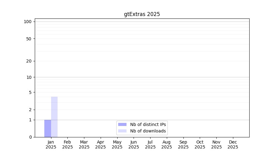 Number of downloads for experiment package gtExtras, year by year, from 2025 back to 2014 (years with no downloads are omitted):