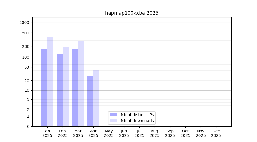 Number of downloads for experiment package hapmap100kxba, year by year, from 2025 back to 2014 (years with no downloads are omitted):