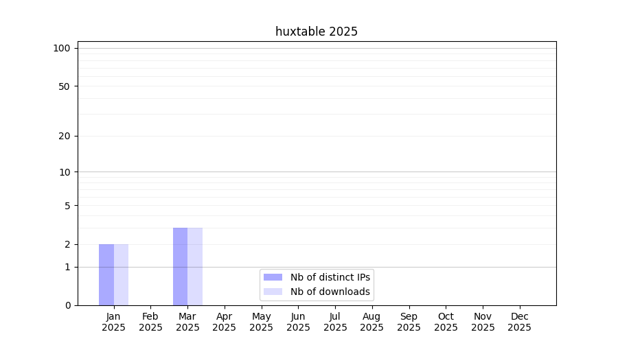 Number of downloads for experiment package huxtable, year by year, from 2025 back to 2014 (years with no downloads are omitted):