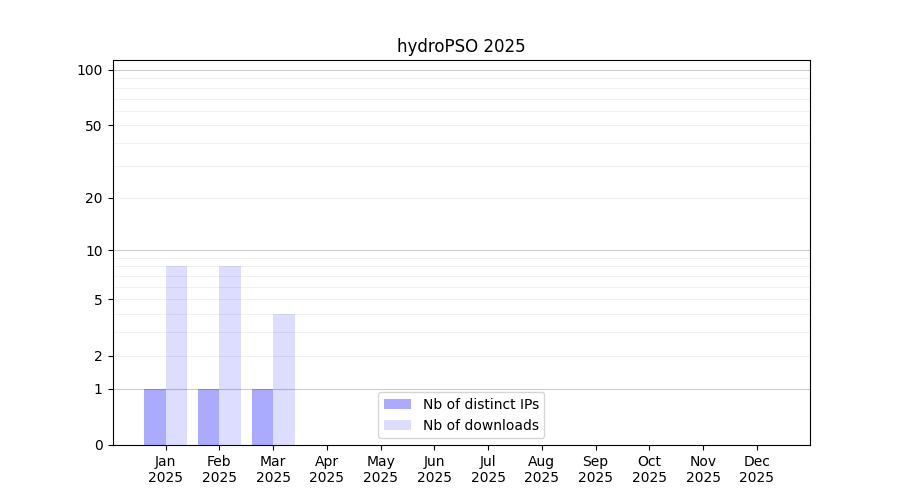Number of downloads for experiment package hydroPSO, year by year, from 2025 back to 2014 (years with no downloads are omitted):