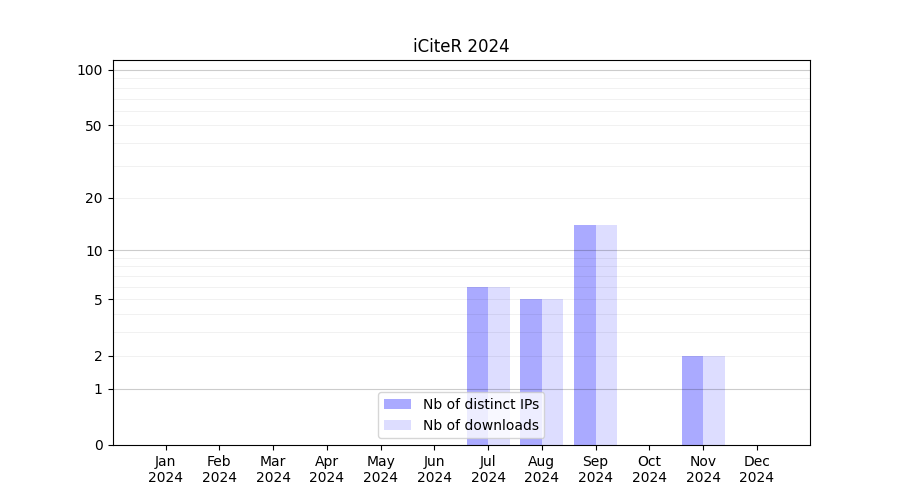 Number of downloads for experiment package iCiteR, year by year, from 2025 back to 2014 (years with no downloads are omitted):