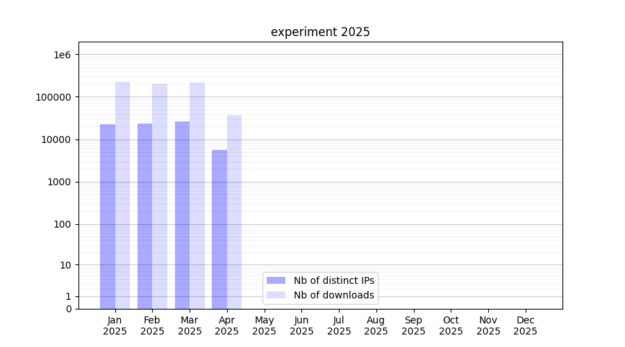 Number of package downloads from the Bioconductor experiment package repository, year by year, from 2025 back to 2014 (years with no downloads are omitted):