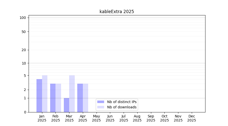 Number of downloads for experiment package kableExtra, year by year, from 2025 back to 2014 (years with no downloads are omitted):