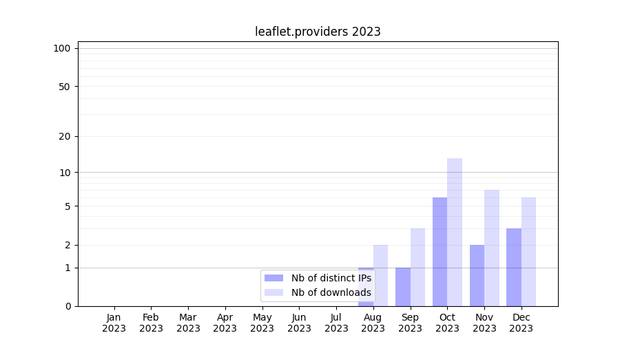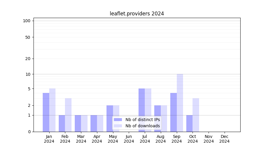 Number of downloads for experiment package leaflet.providers, year by year, from 2025 back to 2014 (years with no downloads are omitted):