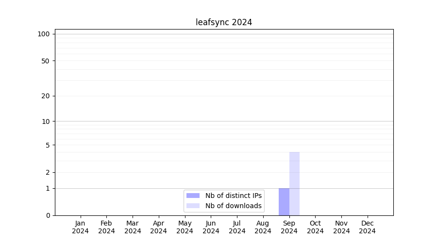 Number of downloads for experiment package leafsync, year by year, from 2025 back to 2014 (years with no downloads are omitted):