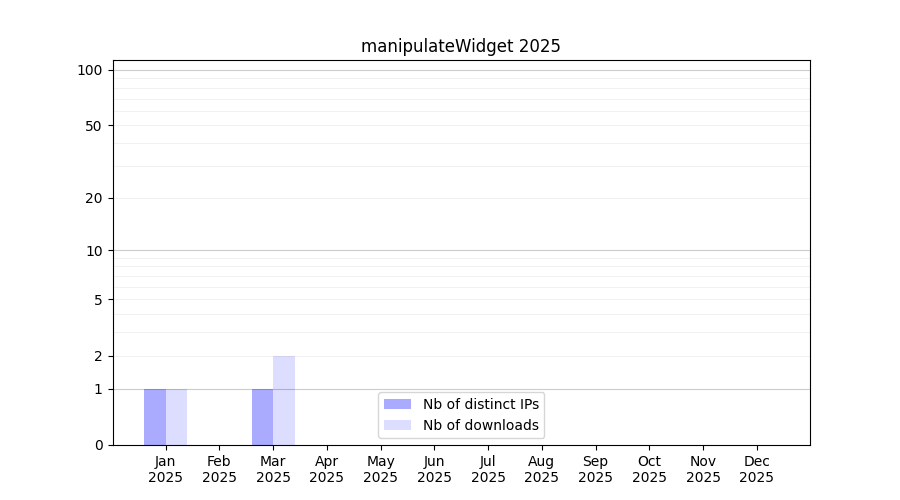 Number of downloads for experiment package manipulateWidget, year by year, from 2025 back to 2014 (years with no downloads are omitted):