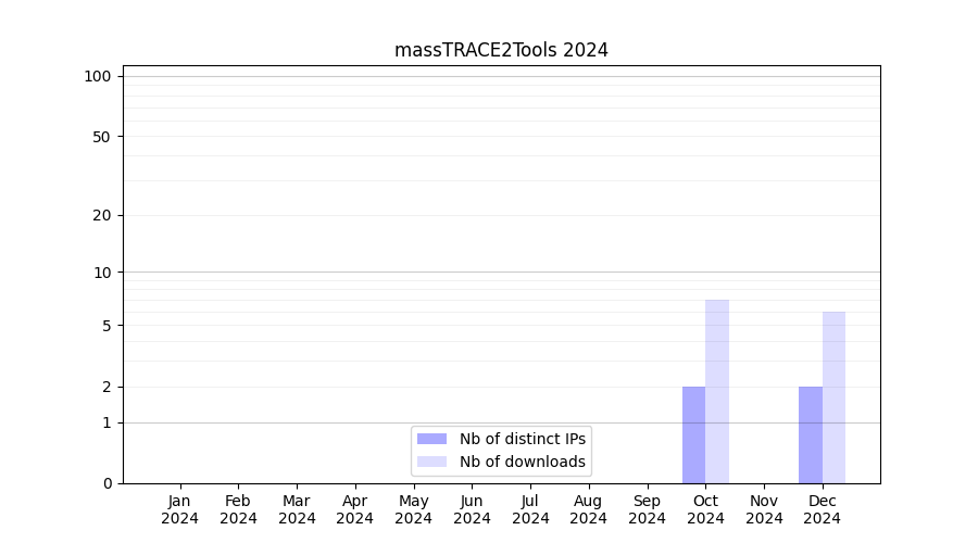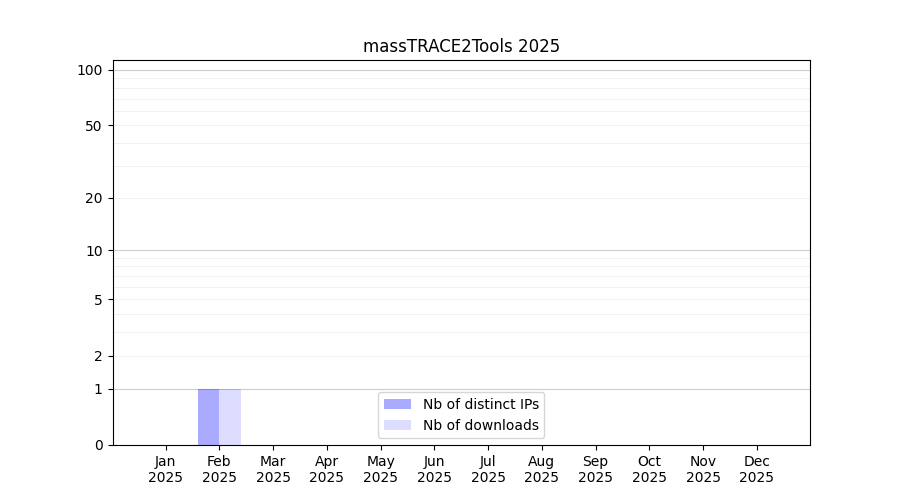 Number of downloads for experiment package massTRACE2Tools, year by year, from 2025 back to 2014 (years with no downloads are omitted):