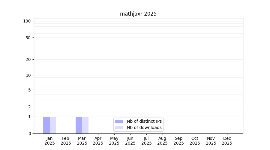 Number of downloads for experiment package mathjaxr, year by year, from 2025 back to 2014 (years with no downloads are omitted):