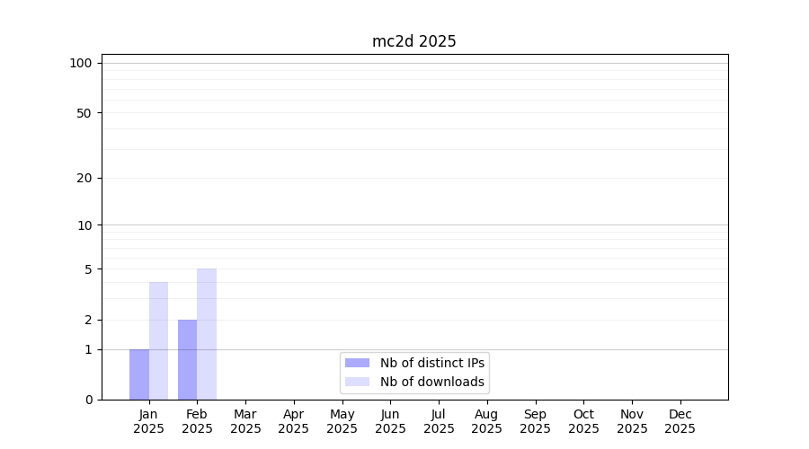 Number of downloads for experiment package mc2d, year by year, from 2025 back to 2014 (years with no downloads are omitted):