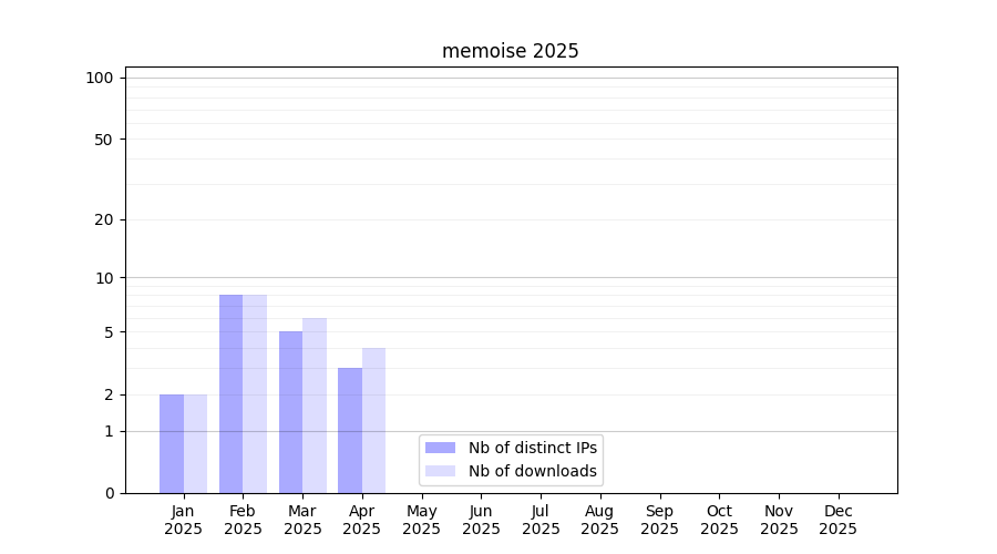 Number of downloads for experiment package memoise, year by year, from 2025 back to 2014 (years with no downloads are omitted):