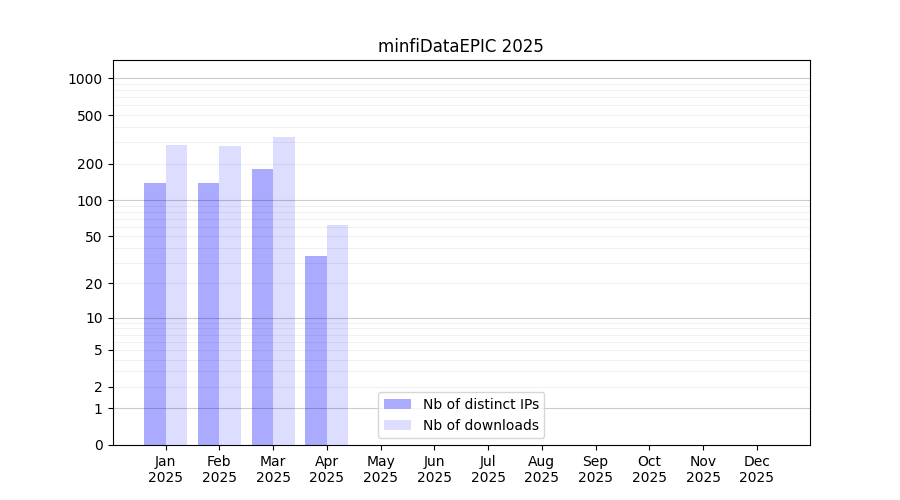 Number of downloads for experiment package minfiDataEPIC, year by year, from 2025 back to 2014 (years with no downloads are omitted):