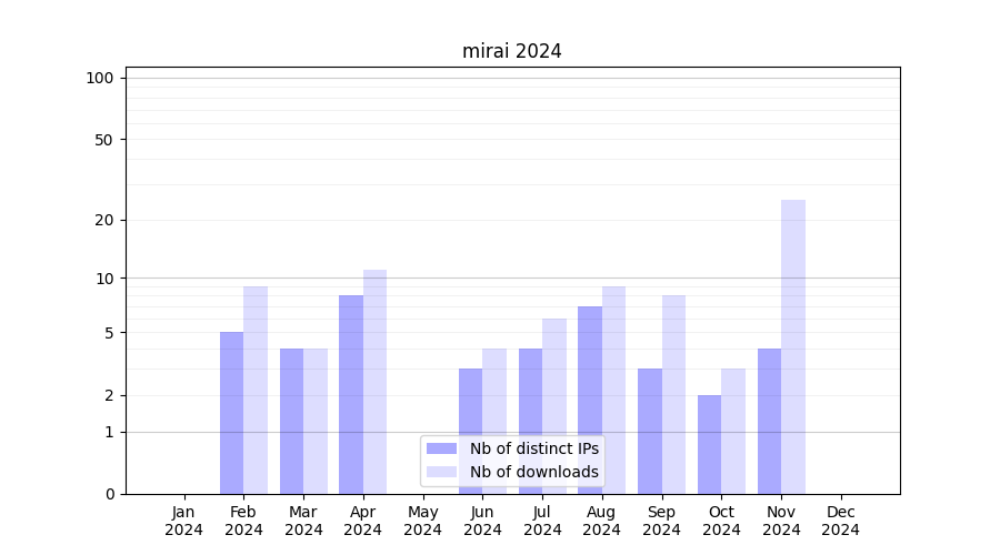 Number of downloads for experiment package mirai, year by year, from 2025 back to 2014 (years with no downloads are omitted):