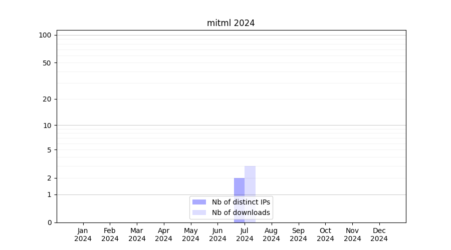 Number of downloads for experiment package mitml, year by year, from 2025 back to 2014 (years with no downloads are omitted):