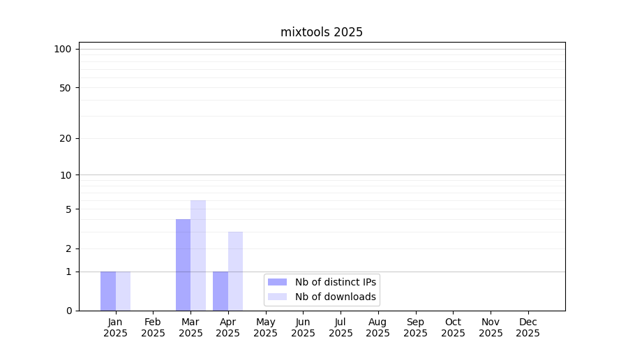 Number of downloads for experiment package mixtools, year by year, from 2025 back to 2014 (years with no downloads are omitted):