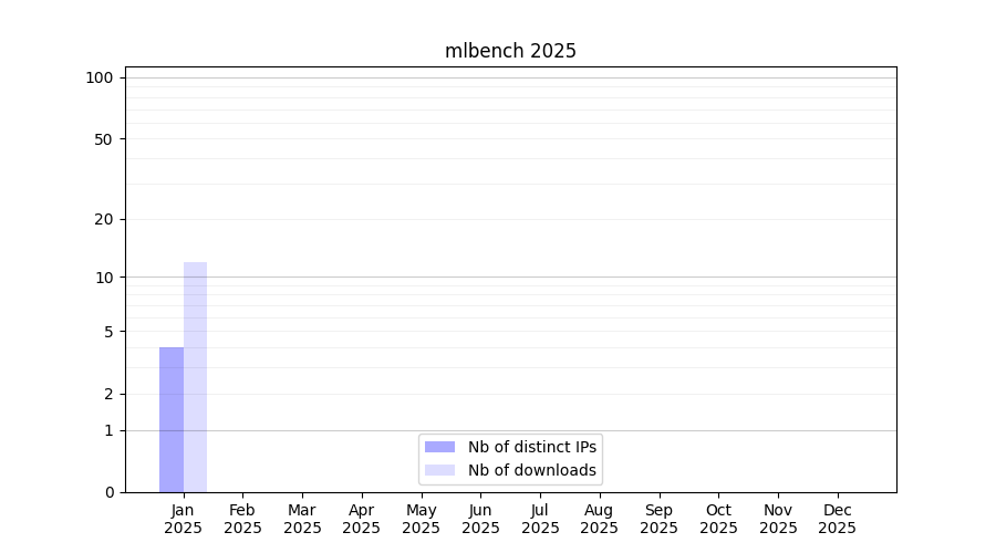 Number of downloads for experiment package mlbench, year by year, from 2025 back to 2014 (years with no downloads are omitted):